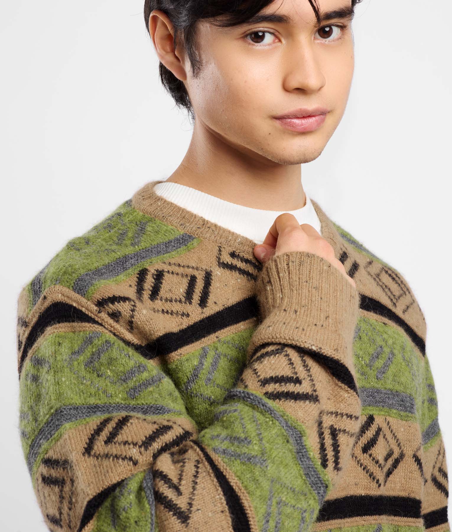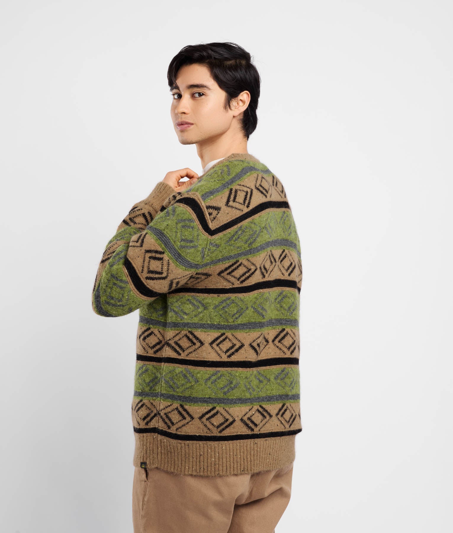 A tribute to Andean heritage in a contemporary tone. Crafted from a refined blend of 83% Baby Alpaca, 9% Sheep Wool, and 8% Donegal, this mid-weight jacquard sweater features brushed-effect bands that bring visual texture and a soft touch. Its reversible design offers two perspectives on the same graphic language, making it a versatile garment that celebrates craftsmanship and timeless design.