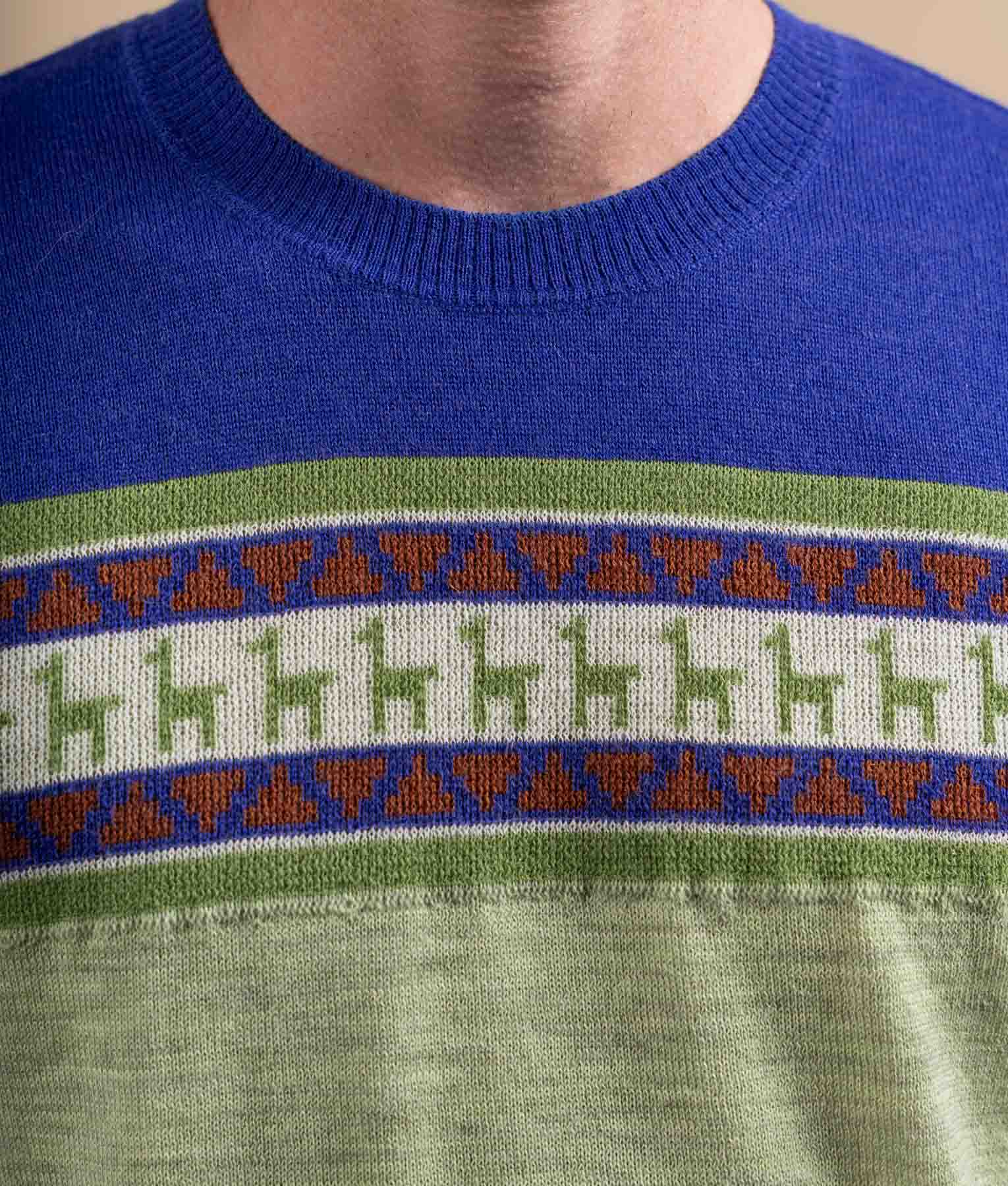 Alpacas On Fences Crew Neck Sweater - Lime Green And Cobalt Blue