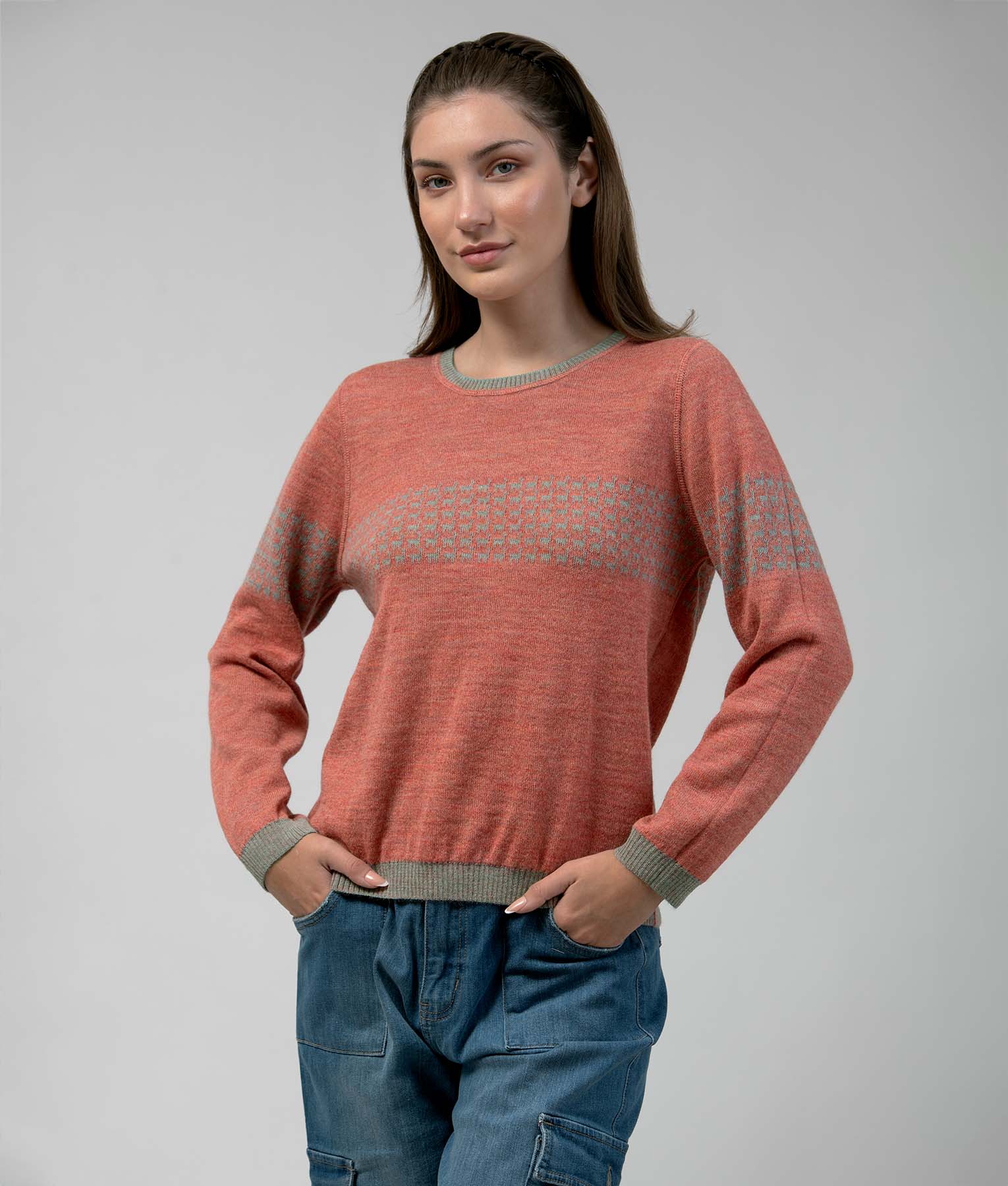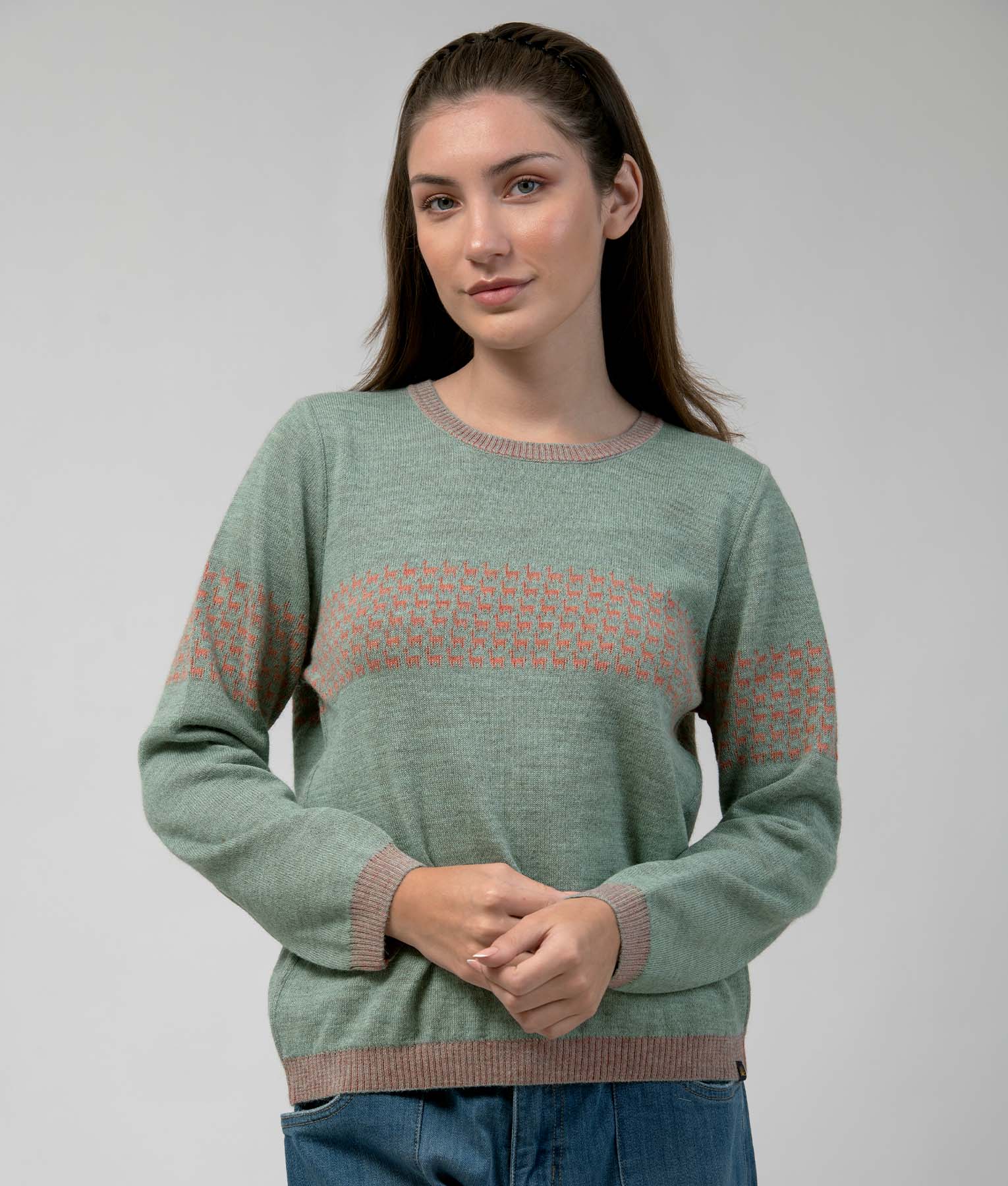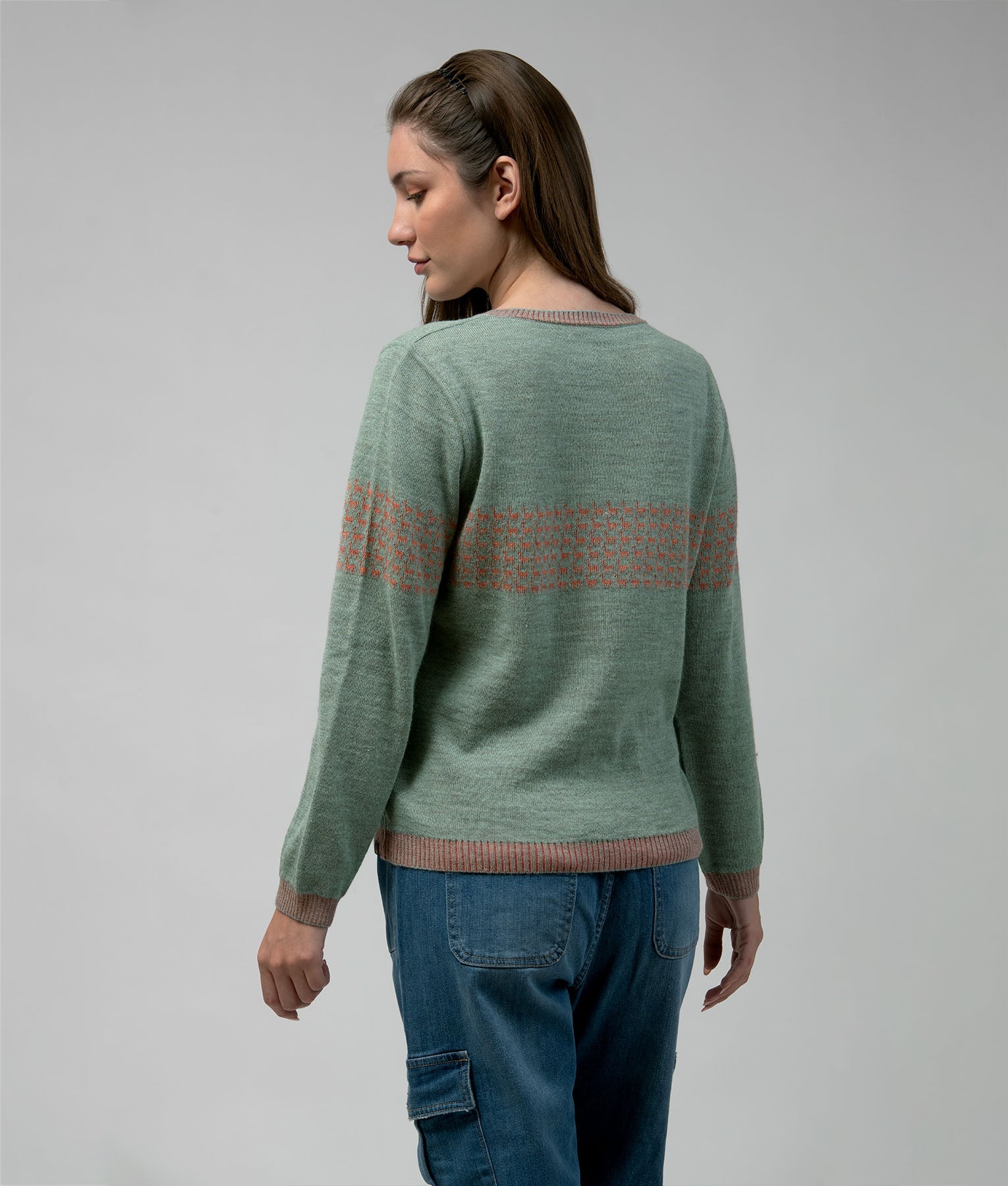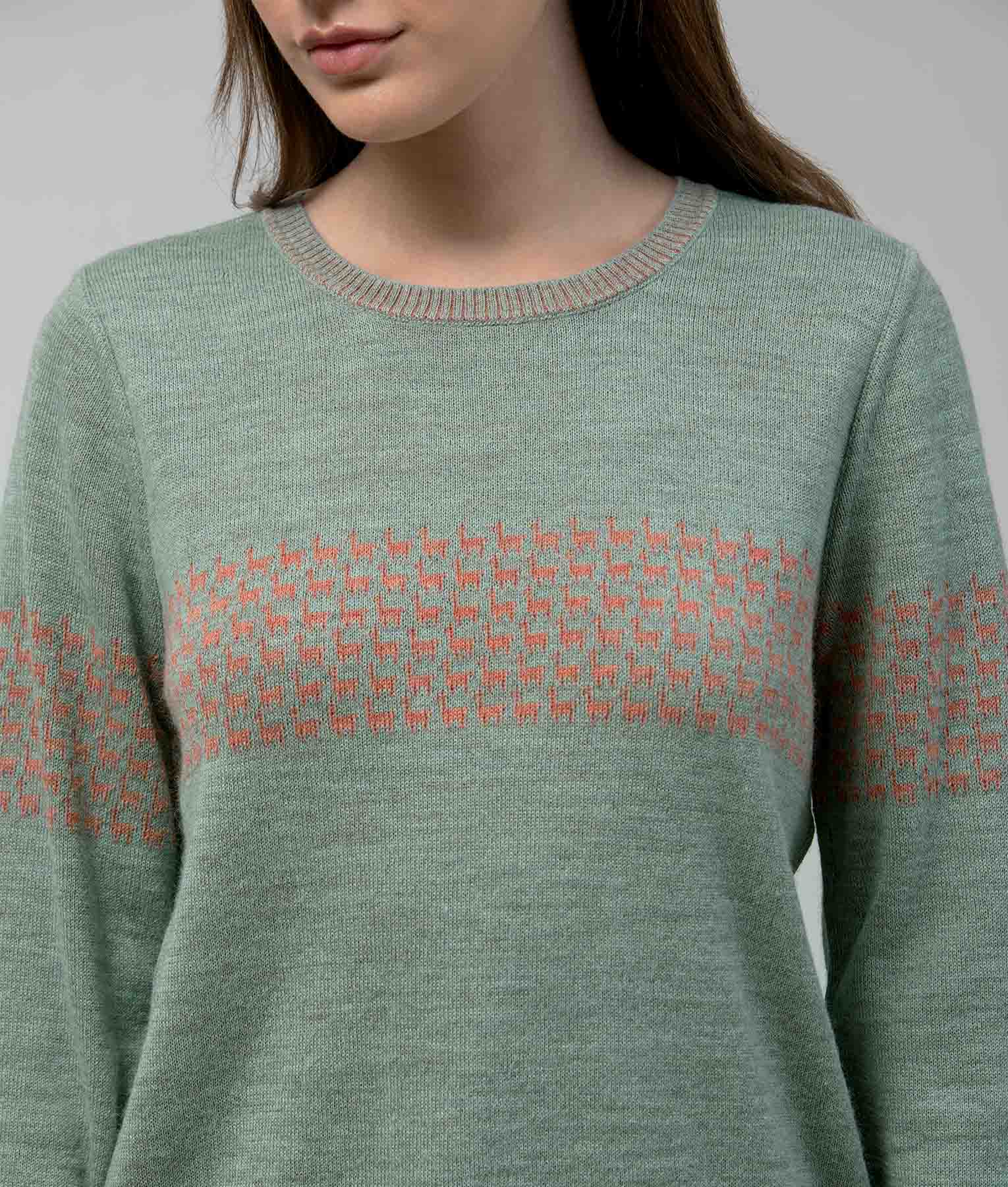 Reversible sweater crafted from 100% baby alpaca. It features a delicate design of small alpacas across the chest and sleeves, adding a charming and distinctive touch. Lightweight, soft, and warm, it’s ideal for any season. The reversible design offers two style options, making it a practical and versatile piece for travel, outings, or everyday wear.